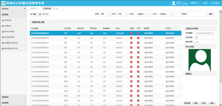 臨沂市縣區(qū)采用本公司的計劃生育育齡婦女虹膜識別管理系統(tǒng),成功實現(xiàn)了身份證、虹膜雙重驗證。通過IE瀏覽器實現(xiàn)了虹膜的采集驗證,實現(xiàn)了信息的集中管理,有效防止作弊。