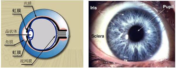 虹膜是眼睛的一個組成部分,位于人眼表面黑色瞳孔和白色鞏膜之間的環(huán)狀區(qū)域(見圖1(b))。圖1 (a)是眼睛的解剖圖,從圖中我們可以看出,虹膜是眼睛的一個內部器官;然而,位于虹膜之前的角膜是透明的,因此虹膜又是外部可見的。