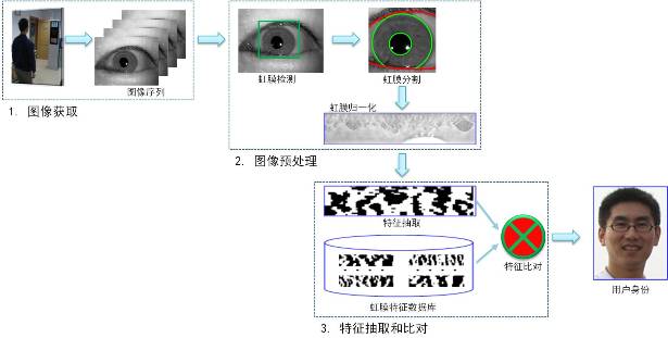 虹膜識別技術流程主要包括虹膜圖像采集、虹膜圖像的預處理、虹膜圖像的特征提取及編碼、以及虹膜圖像的匹配與識別等四個主要部分,其中虹膜圖像的預處理部分又包括了虹膜定位、歸一化以及圖像增強。